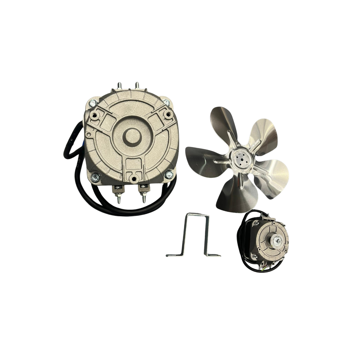 Motor forzador de alto rendimiento para refrigeración, equipado con aspa de 20 cm y soporte metálico. Ideal para optimizar el flujo de aire en evaporadores y condensadores de equipos medianos